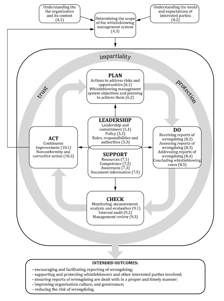 Udało nam się jako pierwszym w Polsce ogłosić informację o publikacji ISO 37002 na LinkedIn’ie . Po szybkim przeglądzie normy warto przytoczyć kilka informacji z samego wprowadzenia, albowiem ISO 37002 zawiera wytyczne dla organizacji w zakresie ustanawiania, wdrażania, utrzymywania i doskonalenia systemu zarządzania zgłaszaniem informacji o nieprawidłowościach, którego efekty są następujące: